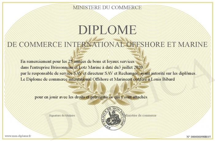 Envoyez par email votre Diplome de commerce international Offshore et Marine personalisé