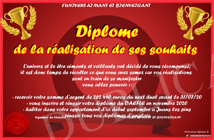 Envoyez par email votre Diplôme de la réalisation de ses souhaits personalisé