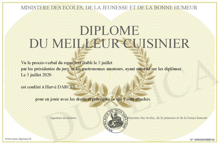 Envoyez par email votre Diplôme du meilleur cuisinier personalisé