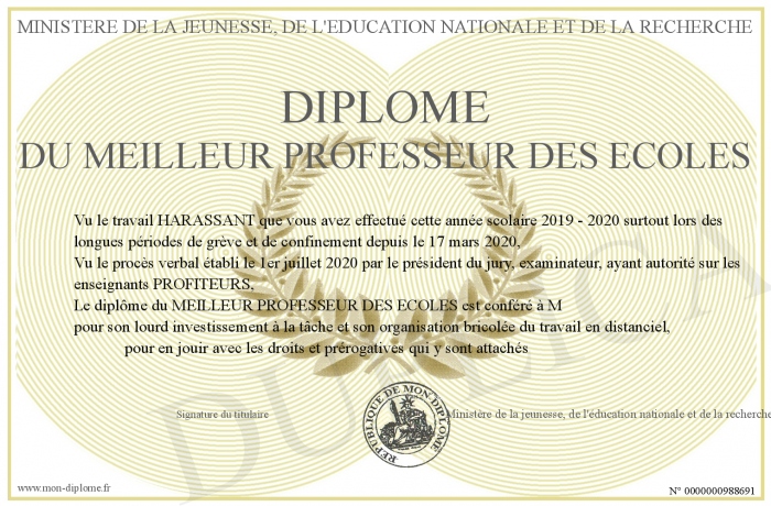 Envoyez par email votre diplôme du MEILLEUR PROFESSEUR DES ECOLES personalisé
