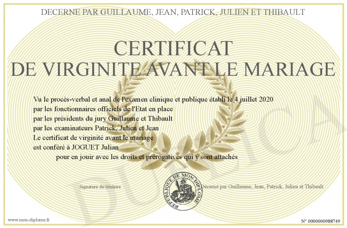 Envoyez par email votre Certificat de virginité avant le mariage personalisé