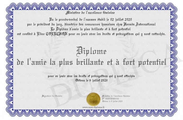 Envoyez par email votre Diplôme de l'amie la plus brillante et à fort potentiel personalisé