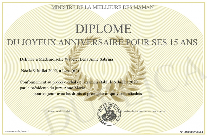 Envoyez par email votre diplôme du joyeux anniversaire pour ses 15 ans personalisé