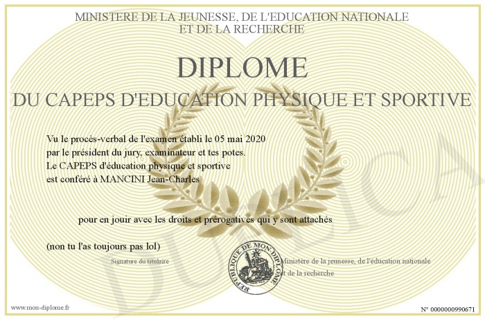 Envoyez par email votre Diplôme du CAPEPS d'education physique et sportive personalisé