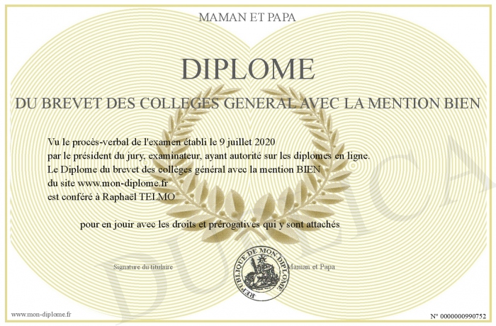 Envoyez par email votre Diplôme du brevet des collèges général avec la mention BIEN personalisé