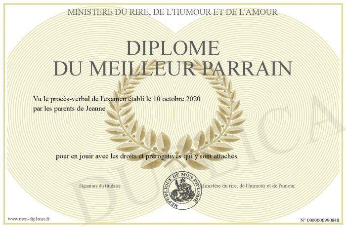 Envoyez par email votre Diplôme du Meilleur Parrain personalisé