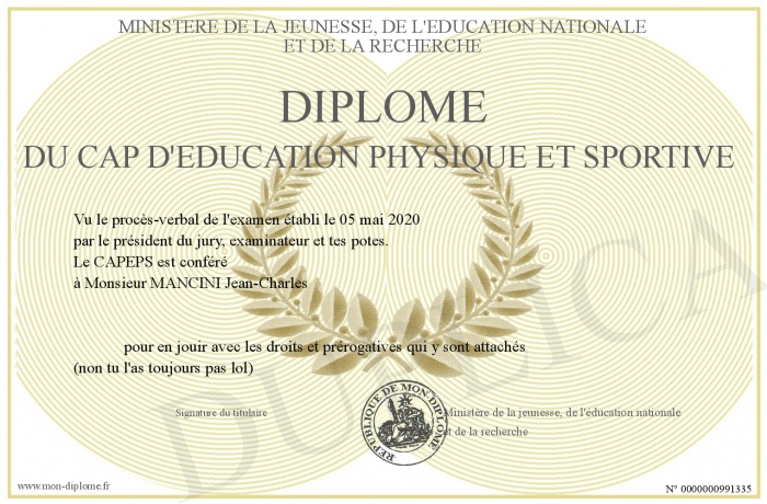 Envoyez par email votre Diplôme du CAP d'education physique et sportive personalisé