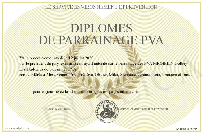 Envoyez par email votre Diplômes de parrainage PVA personalisé