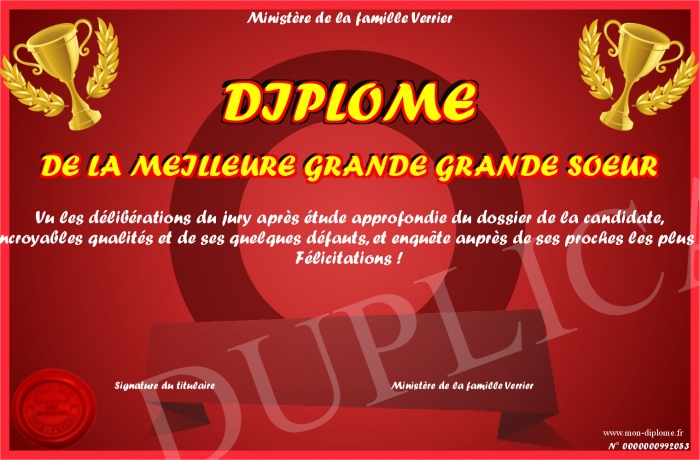 Envoyez par email votre DIPLOME DE LA MEILLEURE GRANDE GRANDE SOEUR personalisé
