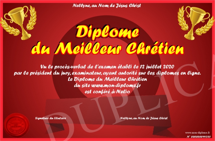 Envoyez par email votre Diplôme du Meilleur Chrétien personalisé