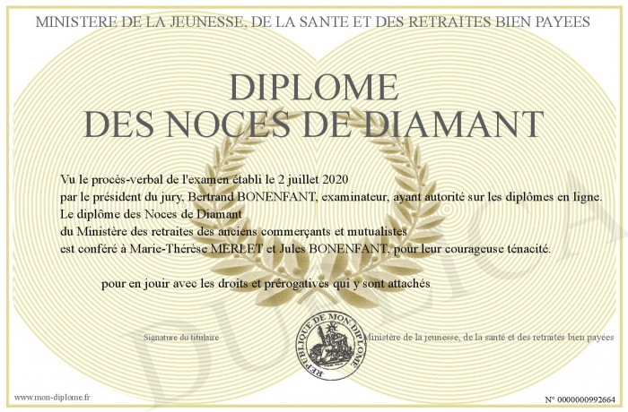 Envoyez par email votre Diplôme des Noces de Diamant personalisé