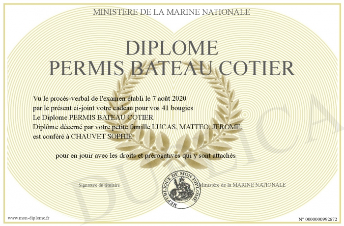 Envoyez par email votre Diplôme PERMIS BATEAU COTIER personalisé