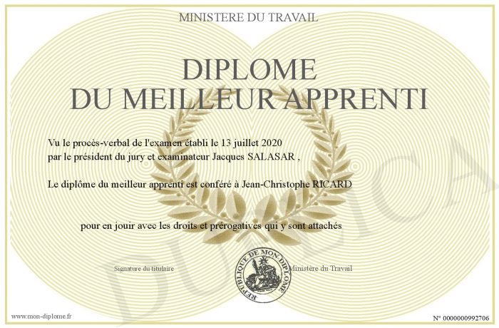 Envoyez par email votre Diplôme du meilleur apprenti personalisé