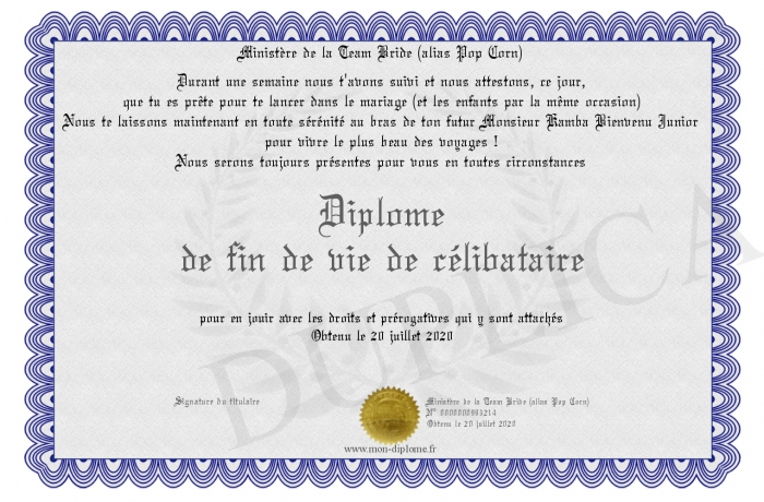 Envoyez par email votre Diplôme de fin de vie de célibataire personalisé