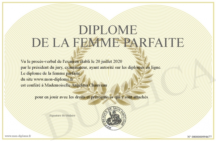 Envoyez par email votre diplôme de la femme parfaite personalisé