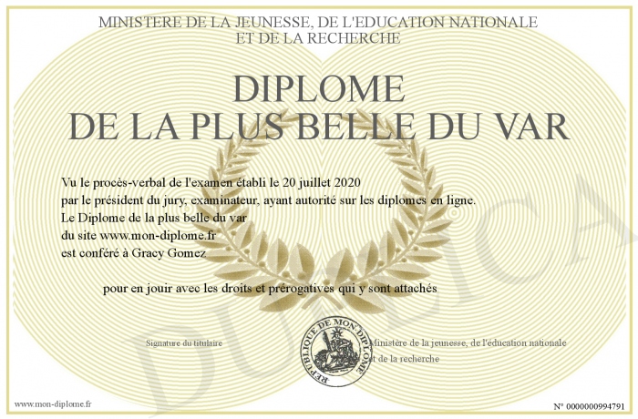 Envoyez par email votre Diplôme de la plus belle du var personalisé