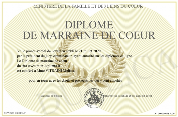 Envoyez par email votre Diplôme de marraine de coeur personalisé