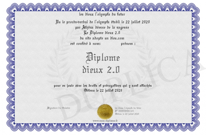 Envoyez par email votre Diplôme dieux 2.0 personalisé