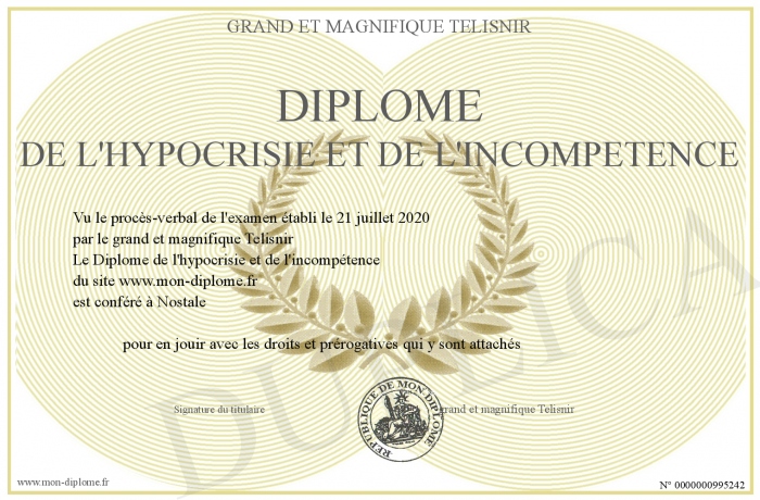 Envoyez par email votre Diplôme de l'hypocrisie et de l'incompétence personalisé