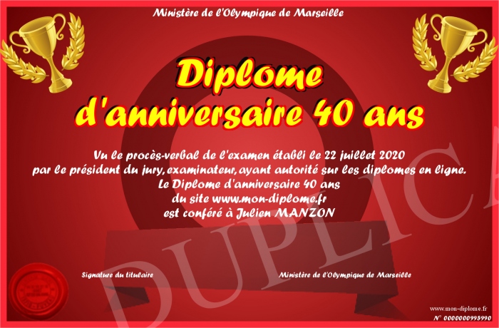 Envoyez par email votre Diplôme d'anniversaire 40 ans personalisé