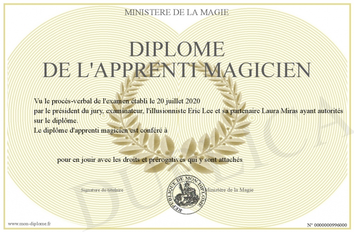 Envoyez par email votre DIPLOME DE L'APPRENTI MAGICIEN personalisé