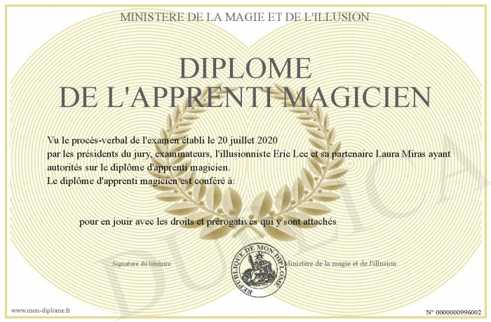 Envoyez par email votre Diplôme de l'apprenti magicien personalisé
