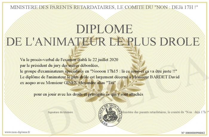 Envoyez par email votre Diplôme de l'animateur le plus drôle personalisé