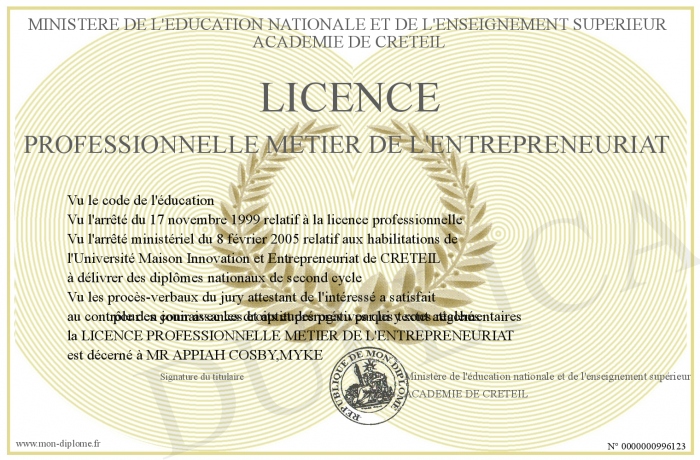 Envoyez par email votre licence Professionnelle metier de l'entrepreneuriat personalisé