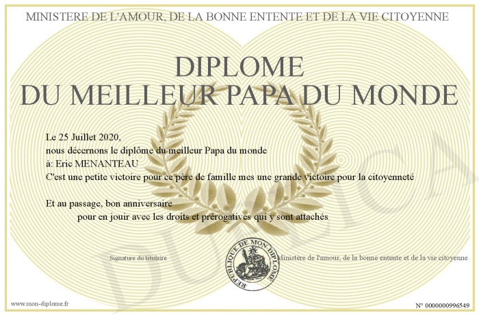 Envoyez par email votre Diplôme du meilleur papa du monde personalisé