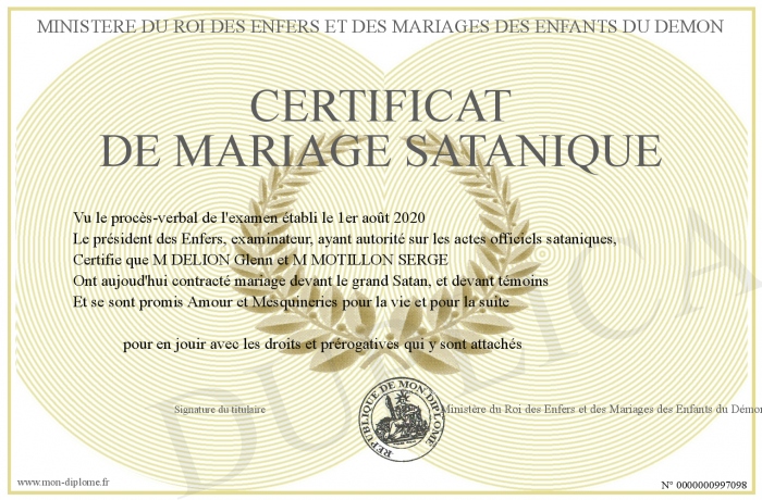 Envoyez par email votre Certificat de Mariage Satanique personalisé