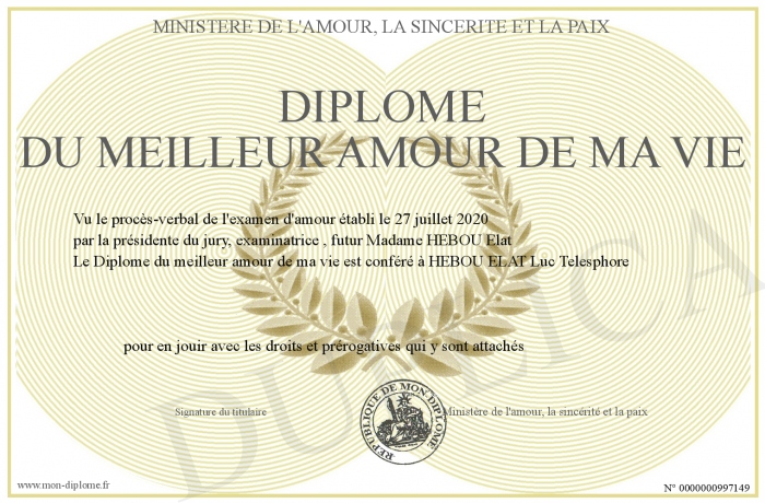 Envoyez par email votre Diplôme du meilleur amour de ma vie personalisé