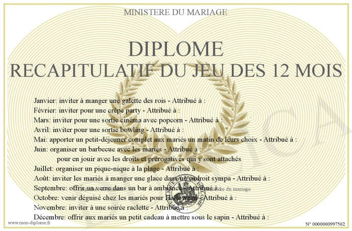Envoyez par email votre Diplôme récapitulatif du jeu des 12 mois personalisé