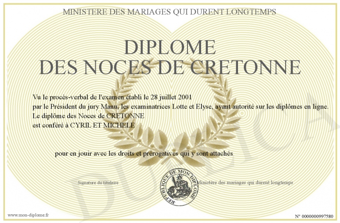 Envoyez par email votre Diplôme des Noces de CRETONNE personalisé