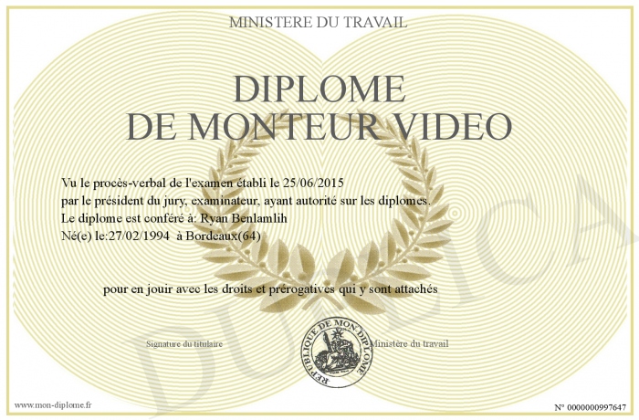 Envoyez par email votre Diplome de monteur vidéo personalisé