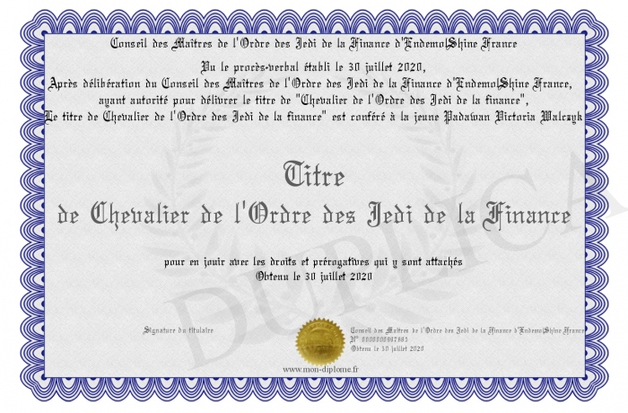 Envoyez par email votre Titre de Chevalier de l'Ordre des Jedi de la Finance personalisé