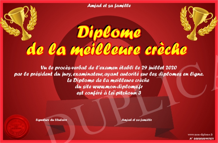 Envoyez par email votre Diplôme de la meilleure crèche personalisé