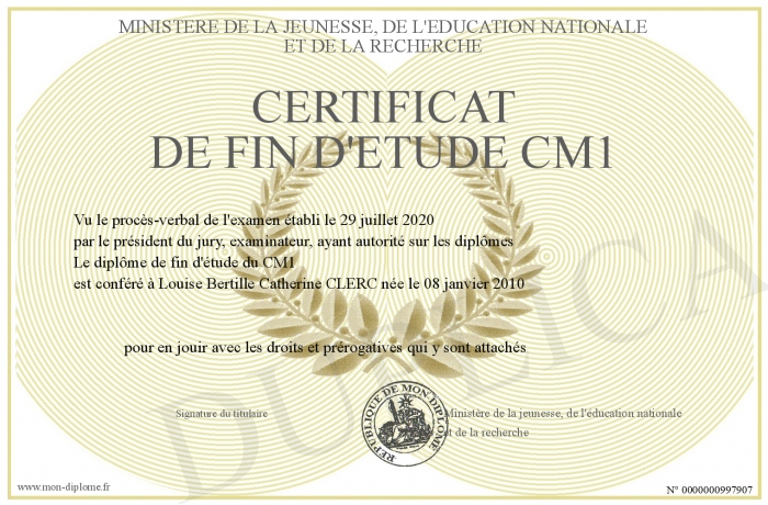 Envoyez par email votre Certificat de fin d'étude CM1 personalisé