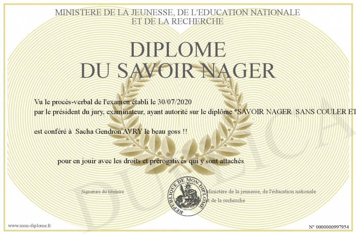 Envoyez par email votre Diplôme du SAVOIR NAGER personalisé