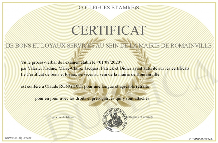 Envoyez par email votre Certificat de bons et loyaux services au sein de la mairie de Romainville personalisé