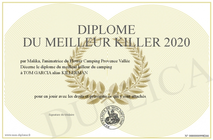 Envoyez par email votre Diplôme du MEILLEUR KILLER 2020 personalisé