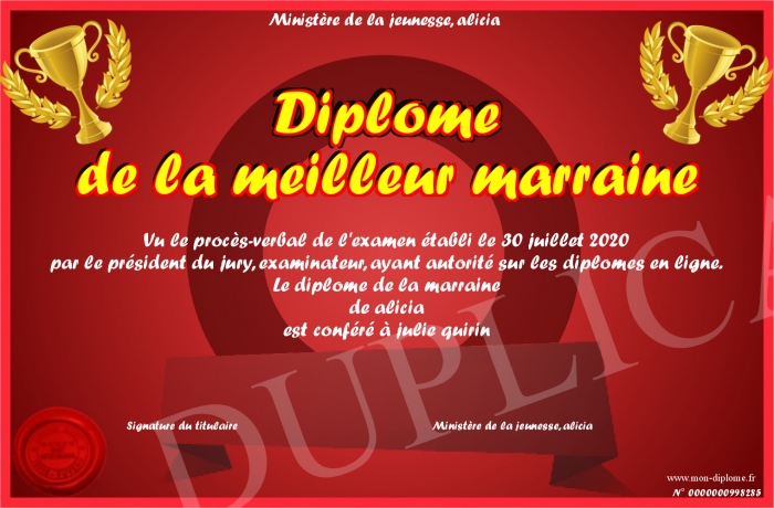 Envoyez par email votre Diplôme de la meilleur marraine personalisé