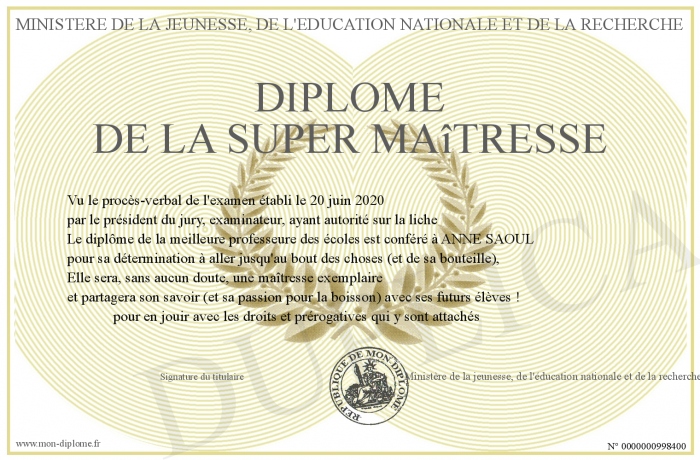 Envoyez par email votre Diplôme de la super maîtresse personalisé