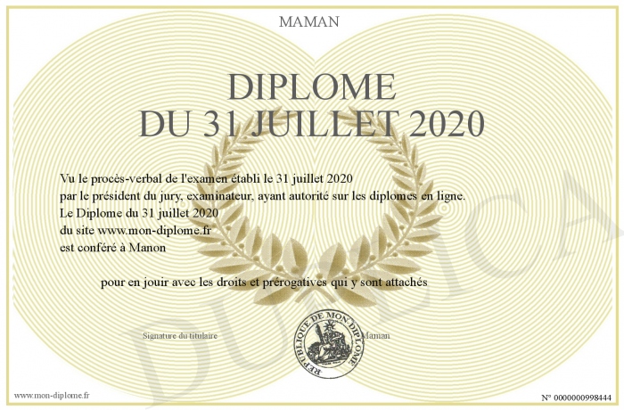 Envoyez par email votre Diplôme du 31 juillet 2020 personalisé