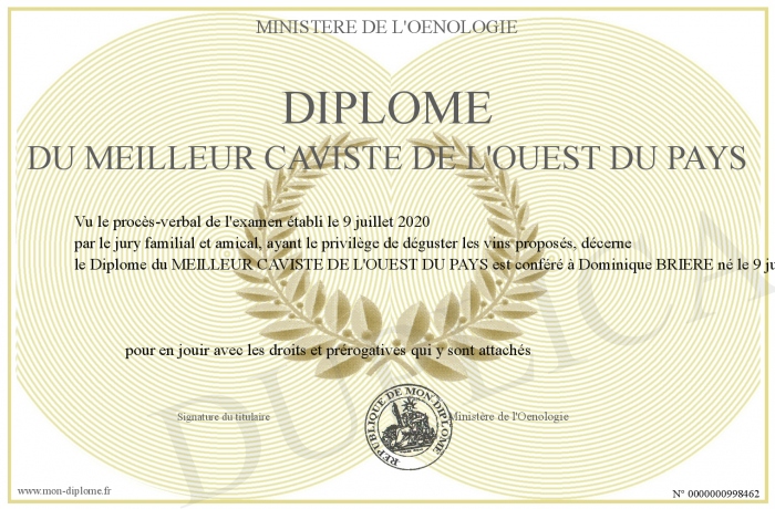 Envoyez par email votre Diplôme du MEILLEUR CAVISTE DE L'OUEST DU PAYS personalisé