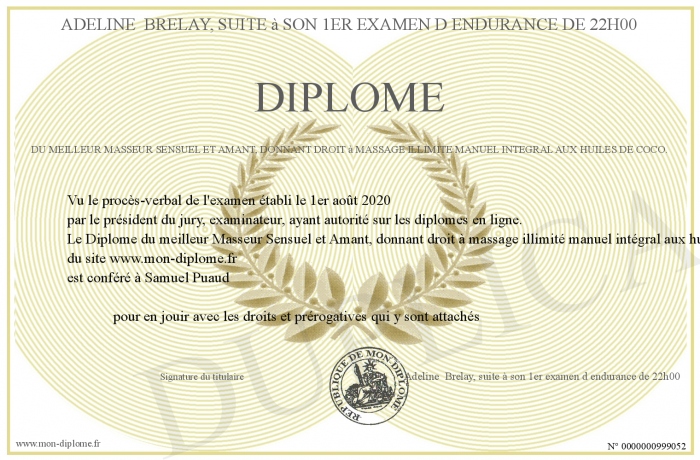 Envoyez par email votre Diplôme du meilleur Masseur Sensuel et Amant, donnant droit à massage illimité manuel intégral aux huiles de coco. personalisé