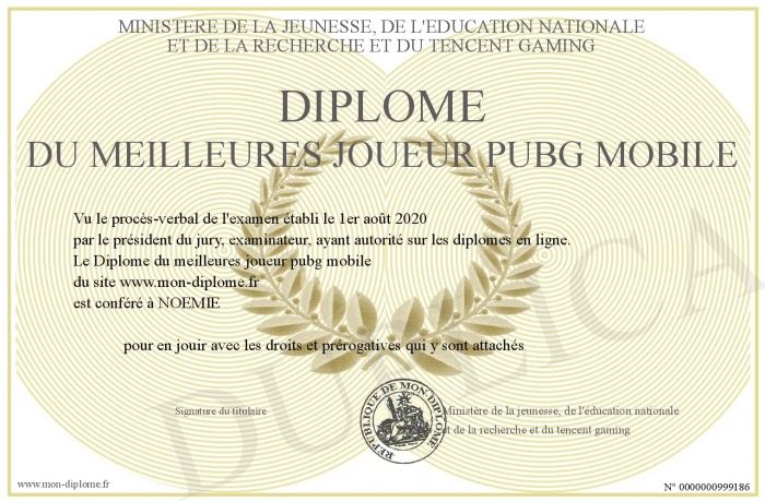 Envoyez par email votre Diplôme du meilleures joueur pubg mobile personalisé