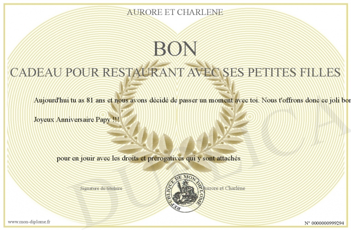 Envoyez par email votre Bon cadeau pour restaurant avec ses petites filles personalisé